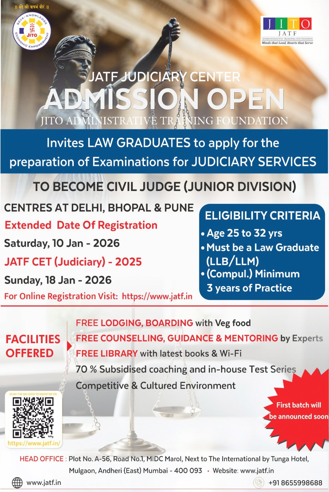 CET-ज्यूडिशियरी 2025 के विद्यार्थियों को मिलेगा विशेषज्ञ मार्गदर्शन महाराष्ट्र जैन वार्ता मुंबई : जैन इंटरनेशनल ट्रेड ऑर्गनाइजेशन (JITO) से संबद्ध जीतो प्रशासनिक प्रशिक्षण फाउंडेशन (JATF) ने न्यायिक सेवा परीक्षा CET-Judiciary-2025 की तैयारी कर रहे विधि स्नातकों के लिए विशेष प्रशिक्षण कार्यक्रम शुरू किया है। इस पहल के अंतर्गत सिविल जज (जूनियर डिवीजन) बनने के इच्छुक … Read more